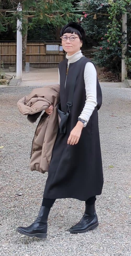 この日に足立美術館に行ったので、理想は2日目のアートな雰囲気漂るメガネとヘアターバンがよかったけども、とにかく寒かったので防寒優先でニット帽。